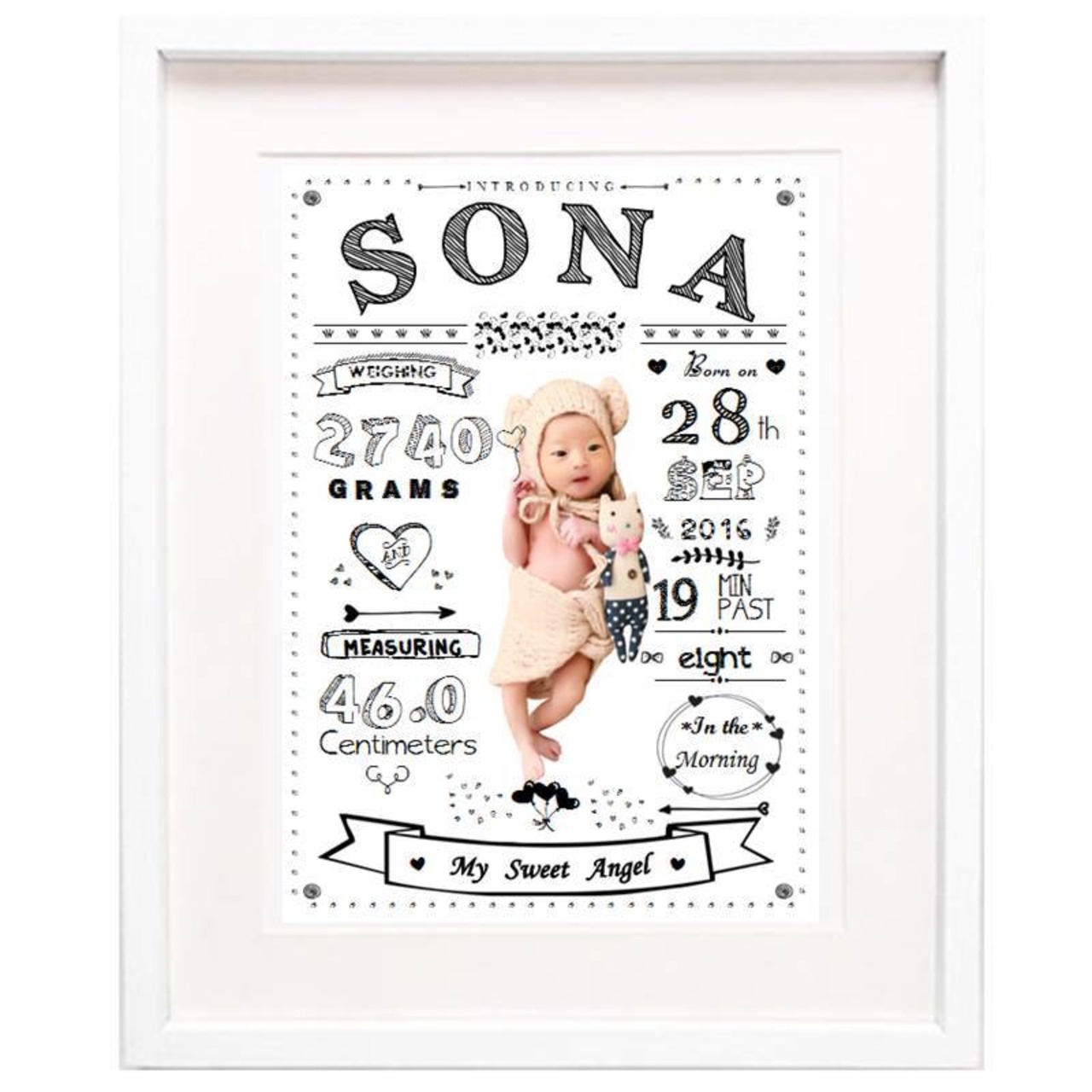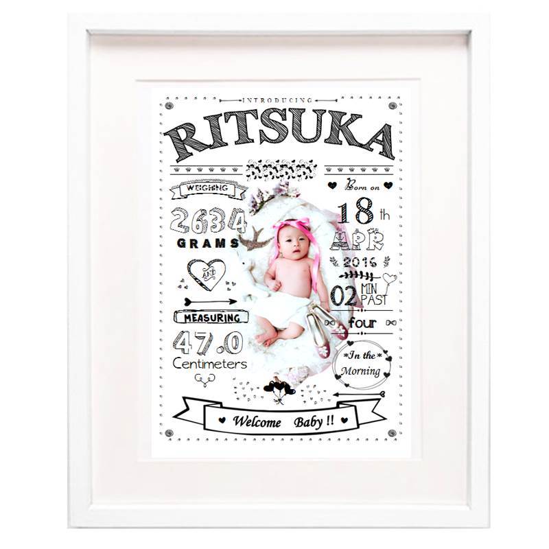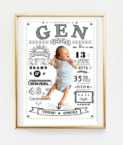 かわいいフォントに囲まれた赤ちゃんのお写真が目立つようなデザインにしました。